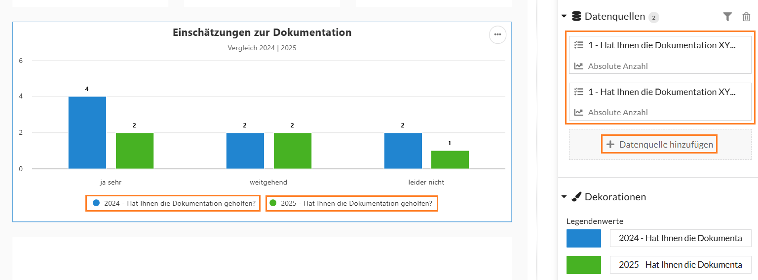 Das Zusammenführen mehrerer Datenquellen kann z. B. bei turnusmäßig durchgeführten Umfragen sinnvoll sein. So können Sie Trends umgehend erkennen und Veränderungen direkt visualisieren. Gleiches gilt, wenn Sie einen Vorher-nachher-Vergleich wie nach einer gravierenden Änderung darstellen wollen oder separate Umfragen verschiedener Zielgruppen (z. B. Führungskräfte und Mitarbeitende) miteinander vergleichen.